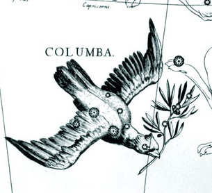 Это созвездие получило название в память об описанной в Библии истории Всемирного потопа, когда благочестивый Ной с домочадцами и домашними животными был спасен по воле Бога. Многие дни скитался их ковчег по бушующему океану. Однажды вконец измученный Ной с угасающей надеждой на спасение решил все-таки выяснить, в каком направлении находится суша. С этой целью он выпустил на волю голубя из клетки. Умная птица вскоре возвратилась, неся в клюве оливковую веточку. И Ной понял, что земля близко и мало того, она богата, раз