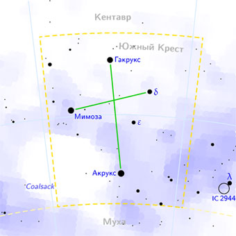 Созвездие Южный крест находится в южном небесном полушарии, и является самым малым созвездием по площади на небосводе. Соседними являются созвездия Мухи и Центавра. Южный крест образуется четырьмя звездами, которые делают фигуру легкоузнаваемой.